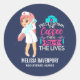 Personalised stickers with a humourous saying: First i drink the coffee, then I save the lives. Perfect for nurses. Featuring an illustration of a female nurse wearing a cute old fashioned nursing hat and carrying a giant hypodermic needle.
