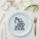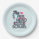 Paper plates with a cute and comical saying. Typography text says: This superhero wears scrubs. Designed with a light blue stethescope and a big pink heart and a pink heart monitor line. A light blue background with faded pink polka dots.