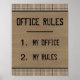 Humourous black and brown plaid "Office Rules" poster. Looks great with a black frame!