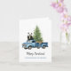 Funny Panda in Blue Vintage Van Christmas Greeting Card. Watercolor drawing of a cute white panda bear in a blue vintage truck and Christmas tree. Personalised text.
