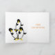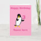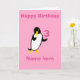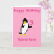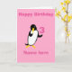 A cute cartoon penguin, childs birthday card, add name age front, any extra message and names inside. Picture inside of three penguins playing.Pink for a girl version.