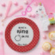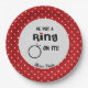 Funny Personalised He put a Ring on it party plates with a red heart and red dots, and a wedding engagement ring with bride to be name.