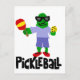 Funny green pickle holding red pickleball paddle and yellow ball. Can also add custom text when ordering.