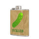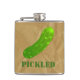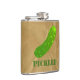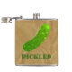 Fun drinking flask, with graphics of a brown paper bag looking background and a big green pickle, on the front. Green text, on the bottom front, reads Pickled and can be personalised to read what you want. Humourous gift idea.