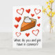 A cute greeting card featuring an illustration of a slice of pumpkin pie with hearts all around it and a joke on the front: "What do you and pie have in common?”. The inside reads, “I love them both. Happy Valentine's Day!” A funny Valentine for a pie lover.