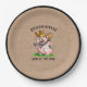 Funny, pink pig / hog wearing a black and white chequered scarf and a brown cowboy hat, sitting on green grass saying, "Soooiiieee look at t'em ribs!" which is a customisable template. Light brown burlap background.