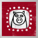 A cute drawn pig in black and white over a red textured background surrounded with white dots.