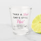 Funny pink and black "Take a Shot She's Still Hot" 30th birthday party shot glass. Add her name, age and the party date.