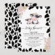 Cute cow themed baby shower invitation for a baby girl featuring a cute black and white cow and calf, a black and white cow print pattern and some lovely pink floral roses arrangements. This holy cow girl's baby shower invitation design is a fun way to invite guests to a cow themed girl's baby shower.