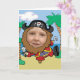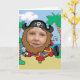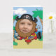 Funny cartoon pirate standing on a beach with the face cut out so you can add your own photo. Makes a great gift!