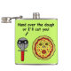 This silly, humourous pun design shows a pizza slicer saying to a scared cartoon pizza, "Hand over the dough or I'll cut you!" The pizza cutter is wearing a black mask like a mugger and the pizza is making a scared face in the form of a round pepperoni mouth, olive eyes and a mushroom nose.