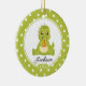 Dated & personalised funny Christmas Ornament featuring a pizza eating dinosaur set on white background and framed with a green and white polka dots. . A Wonder Christmas gift sure to be treasured for many years to come.