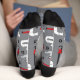 Fun plumber patterned socks printed with toilet plungers, pipes, wrenches and taps on a grey background
