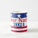 This funny, patriotic, American flag style coffee mug features a sample name with the election year "2024" printed in blue and the name enlarged and printed in red. You can personalise the mug to include your own custom name or text. A band of white stars over a dark blue background appear above the slogan and a band of red and white stripes appear below the slogan. The patterns and colours represent the American flag.