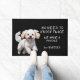 "No need to knock twice, We have a Poodle" declares this funny door mat. The text is in white at the right side, while an image of an adorable white Poodle is at the left. Everything is placed on a black background.