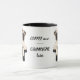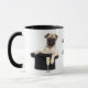 This is a cute mug that will put a smile on the face of your office co-workers! It features an adorable fawn coloured pug dog sitting in a black top hat. In front of him is a glass of bubbly champagne. The image is printed twice on the mug, with the text between them that says "COFFEE now --- CHAMPAGNE later". The text is in a customisable field, so that you may change it if you'd like.