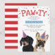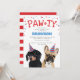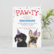 Cute doggy birthday party invitations featuring a french bulldog and dachshund, both wearing party hats, red & blue confetti, the word "PAW-TY", and a simple pet party template.