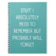 Simple lined teal blue notebook for notes, to do lists, and more with a funny cover quote - Stuff I Absolutely Need to Remember But Probably Will Forget.