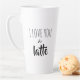 Funny Quote I Love You A Latté Latte Mug is a simply calligraphy script lettering design in white and black. Humourous phrase "I love you a latté" is on both front and back of the large mug. Also available in small size. Makes a great gift idea for someone who loves coffee or latte.