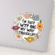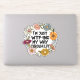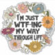 Funny life quote "I'm just WTF-ing my way through life" with black text and a daisy floral wreath.
