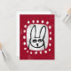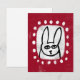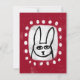 A cute drawn rabbit in black and white over a red textured background surrounded with white dots.