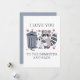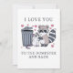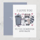 Funny Valentine's Day flat card with a cute design of a raccoon and a rat illustration, and the message "I love you to the dumpster and back". All text is editable, and on the back, there's space to add a message or leave it blank to handwrite it.