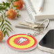 Keep your keys on this sturdy acrylic key-chain with a freshly pulled Molar on a red starburst. The background is yellow with a red border.