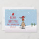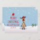 A cute and funny Christmas illustration: A reindeer with footsteps in the snow and a big typography Merry Christmas and a happy New Year tree.