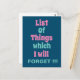 Funny Reminder for Forgetful People Postcard with a funny reminder quote - List Of Things which I will FORGET !!!
