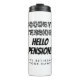 Funny retirement travel thermal mug for retiree. Create your own gift with fun quote. Humourous typography design for retired dad, brother, uncle, grandpa, coworker, colleague, company boss, teacher, trainer, husband, pensioner, best friend, sports coach, nurse etc. Black and white or custom colour. Personalise with name. Handy tumblers for warm coffee and other drinks.