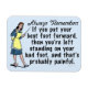 The original, funny demotivational / fake inspirational quote on this flexible magnet says, "Always remember: If you put your best foot forward, then you're left standing on your bad foot, and that's probably painful." It has a retro 40's or 50's graphic of a woman holding a teacher's pointer and wearing an apron, holding out one foot while she stands on the other. The background is light blue. This is a humourous saying for anyone who likes sarcasm and would also be good for a podiatrist.