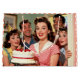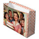 A fun surprise birthday party gift bag. The front illustration is a group of retro mid-century friends gathering to surprise someone for their birthday holding a cake with funny awkward expressions.