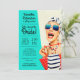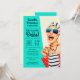 A unique retro style bridal shower Invitation, this design features an outrageously stylish woman in striped sunglasses and hair turban with a polka dot bag and striped towel. The humour is carried out in the whimsical text style. The retro colour scheme of aqua, beige, navy and red adds to the fun of the design. Personalise the details with your desired text and you're all set for a fabulous bridal shower celebration.