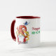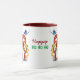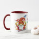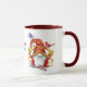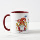 A big nosed, white bearded, funny little gnome wears a red and gold Santa Hat embellished with reindeer images on this cute Holiday mug. He is getting a bit tangled in the gold ribbon he holds! Two birds, a red cardinal and a blue jay, perch on him. The image is placed on two sides of the mug, with custom text in red and green in the middle that says "Happy HO HO HO". Cute!