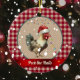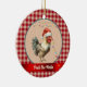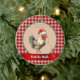 This funny "Peck the Halls" rooster Christmas ornament adds a little farmhouse humour to your holiday decor or Christmas tree. This charming chicken with a Santa hat adds some farmyard whimsy with a touch of holiday poultry fun. A string of lights hangs above the rooster's head, with a partial string of lights hanging from its beak. The rooster is on a pattern of faux tan and white dotted Swiss surrounded by a country style gingham plaid. You can change the humourous text under the rooster, which appears in cream across a ribbon, such as adding your name or year.