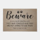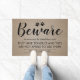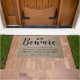 Funny vintage door mat featuring a rustic brown burlap effect background, paw prints, the word "Beware" in an elegant calligraphy font, and humourous sayings about dogs in your household!
