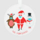 Funny Christmas holiday ornament to commemorate a year of quarantine and social distancing featuring a hip cool retro Santa Claus, a snowman and a reindeer wearing face masks. You can personalise the text "Christmas 2020" on one side and you name on the other side.