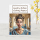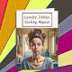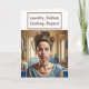 Funny tired housewife with crazy hair, messy bun, messy house, laundry saying getting a job would be a break from housework.
