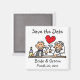 Save the Date magnets with a cute cartoon bride and groom! Customise with the names of the bride & groom, and the wedding date in the space provided.