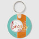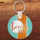 This girls' volleyball keychain with custom name features the fun play-on-words saying "beach please" in colourful sunset ombre typography overlying a white volleyball graphic - background is teal with a wide vertical orange stripe - by katz_d_zynes | part of katzdzynes' Volleyball "beach please" collection >>> https://www.zazzle.com/collections/119616850927081153 and Volleyball Keychains collection >>> https://www.zazzle.com/collections/119042498553482541