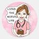 Living the scrub life. Funny hand drawn Caucasian brunette nurse, doctor, caregiver humour sticker.