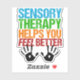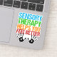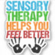 Occupational therapist sticker that says Sensory Therapy Helps You Feel Better in fun, bright colours of blue, green, orange and red. A set of handprints are underneath symbolising the benefits that children get from exercises such as finger painting and playing.