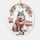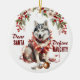 On the front of this Holiday ornament is the image of a Siberian Husky dog sitting with a broken tree ornament in front of him. He is wrapped in string of glowing Christmas lights. The red text says "Dear SANTA Define NAUGHTY". On the back, red and green text says MERRY CHRISTMAS", and there are additional text fields for you to customise to whatever you'd like.