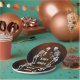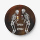 Fun party paper plate, with graphics of two skeletons mingling and drinking, against a dark rust background. Personalise the white text for your Halloween event.