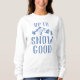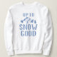 Funny ski bachelorette sweatshirt featuring a drawing of winter mountains, trees, a skier, and the humourous saying "up to snow good".