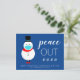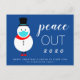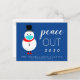 Funny modern Christmas holiday postcard celebrating the end to a tough 2020. A cartoon snowman is wearing a face mask standing next to "Peace Out 2020" in fun white typography against a blue background. You can personalize the greeting (initially set to "Merry Christmas & Cheers to a New Year") and your name.