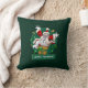 A funny snowman cartoon on a Christmas themed pillow or cushion. Use "Personalize this template" to change the "Merry Christmas!" text and create a unique, customized item; text changes are reflected on both sides. Decorate your house this Christmas with a pillow featuring an excited snowman dressed up as Santa Claus, jumping out of a Christmas present like a jack-in-the-box. The box is wrapped in gold paisley wrapping paper and a green ribbon with white snowflakes.