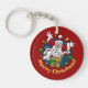 A funny snowman cartoon on a keychain or key ring for Christmas. Use "Personalize this template" to change the "Merry Christmas!" text and create a unique, customized item; text changes are reflected on both sides. It's maximum Christmas with this excited snowman dressed up as Santa Claus, jumping out of a Christmas present like a jack-in-the-box. The surprise gift is wrapped in gold paisley wrapping paper and a green ribbon with white snowflakes. An ideal stocking filler.