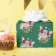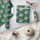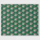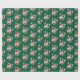 A funny snowman cartoon on Christmas wrapping paper. It's maximum Christmas with this excited snowman dressed up as Santa Claus, jumping out of a Christmas present like a jack-in-the-box. The surprise gift is wrapped in gold paisley wrapping paper and a green ribbon with white snowflakes.