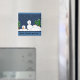 Cute snowman magnet. Little snowman in need of some help! Trees and snow in the background on a starry night.